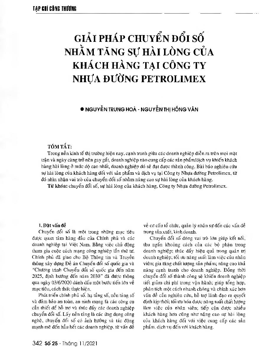 Giải pháp chuyển đổi số nhằm tăng sự hài lòng của khách hàng tại công ty Nhựa đường Petrolimex = Some digital transformation solutions to improve the customer satisfaction of Petrolimex Asphalt Company Limited