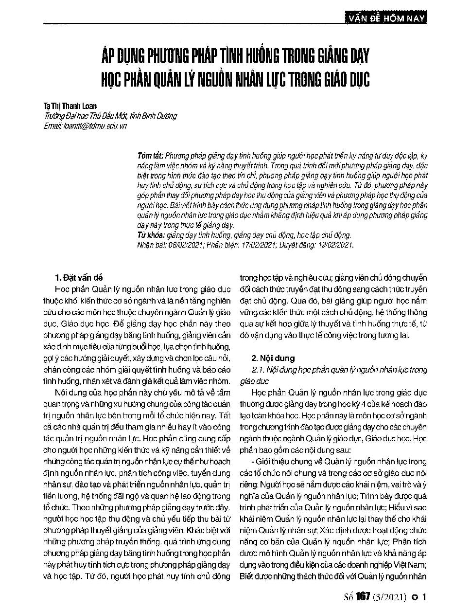 Áp dung phương pháp tình huống trong giảng dạy học phần quản lý nguồn nhân lực trong giáo dục = Applying situational method in teaching the human resource management module in education