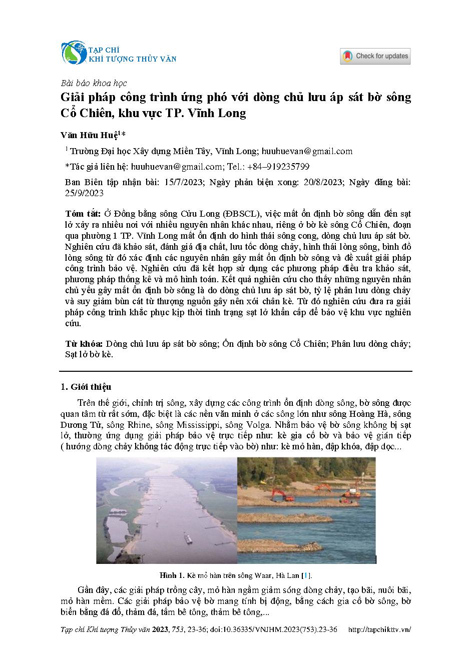 Giải pháp công trình ứng phó với dòng chủ lưu áp sát bờ sông Cổ Chiên, khu vực TP. Vĩnh Long = Construction solutions to cope with the mainstream close to the Co Chien river bank, Vinh Long City area