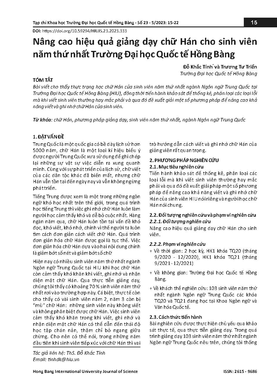 Nâng cao hiệu quả giảng dạy chữ Hán cho sinh viên năm thứ nhất Trường Đại học Quốc tế Hồng Bàng = Improving the efficiency of teaching Chinese script for first year students at Hong Bang International University