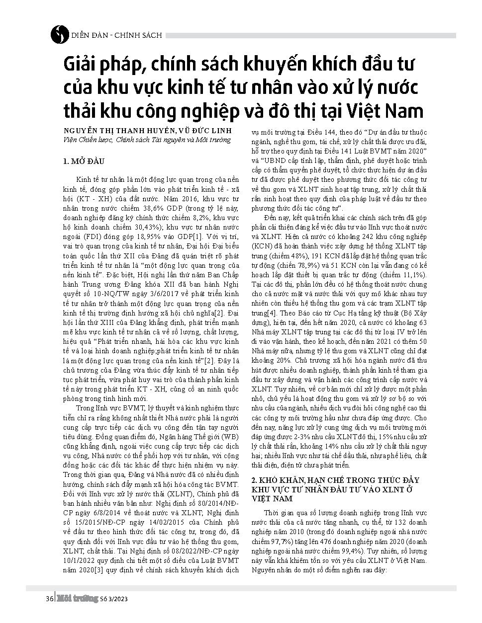 Giải pháp, chính sách khuyến khích đầu tư của khu vực kinh tế tư nhân vào xử lý nước thải khu công nghiệp và đô thị tại Việt Nam