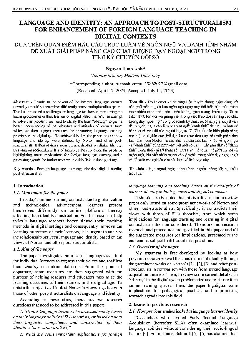 Dựa trên quan điểm hậu cấu trúc luận về ngôn ngữ và danh tính nhằm đề xuất giải pháp nâng cao chất lượng dạy ngoại ngữ trong thời kỳ chuyển đổi số = Language and identity: an approach to post-structuralism for enhancement of foreign language teaching in d