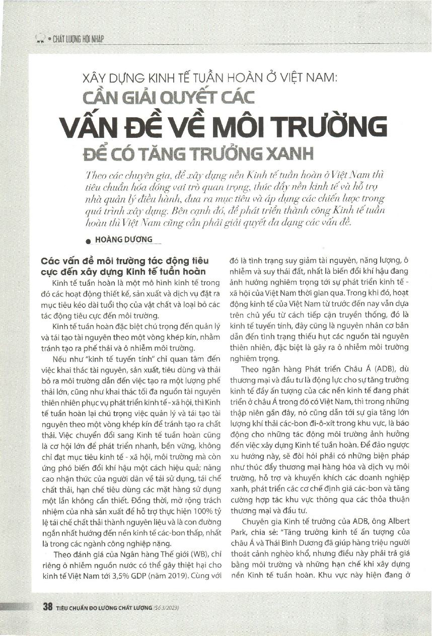 Xây dựng Kinh tế tuần hoàn ở Việt Nam: Cần giải quyết các vấn đề về môi trường để có tăng trưởng xanh = Building a Circular Economy in Vietnam: Need to solve environmental issues for green growth