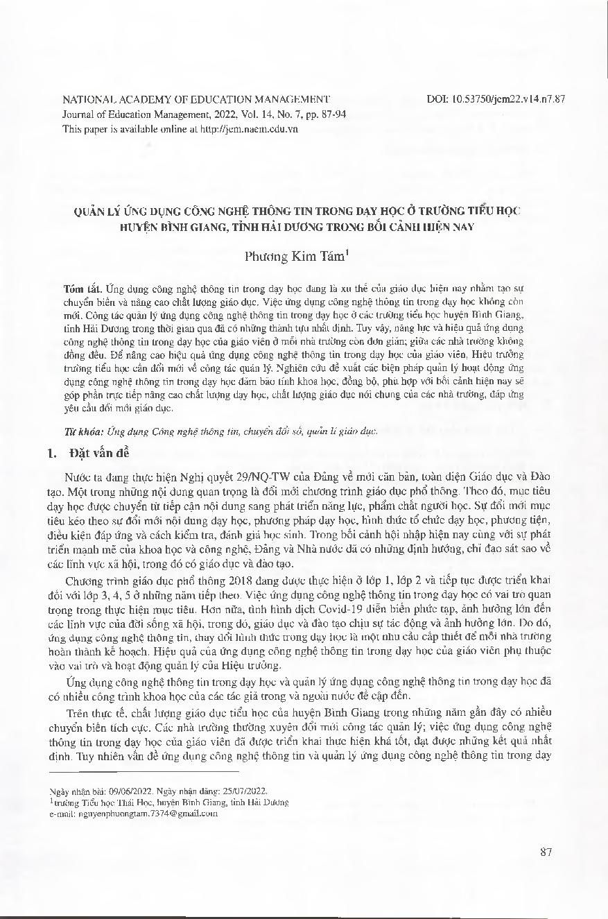 Quản lý ứng dụng công nghệ thông tin trong dạy học ở trường tiểu học huyện Bình Giang, tỉnh Hải Dương trong bối cảnh hiện nay = Management of information technology application in teaching in Binh Giang district elementary school, Hai Duong province in th