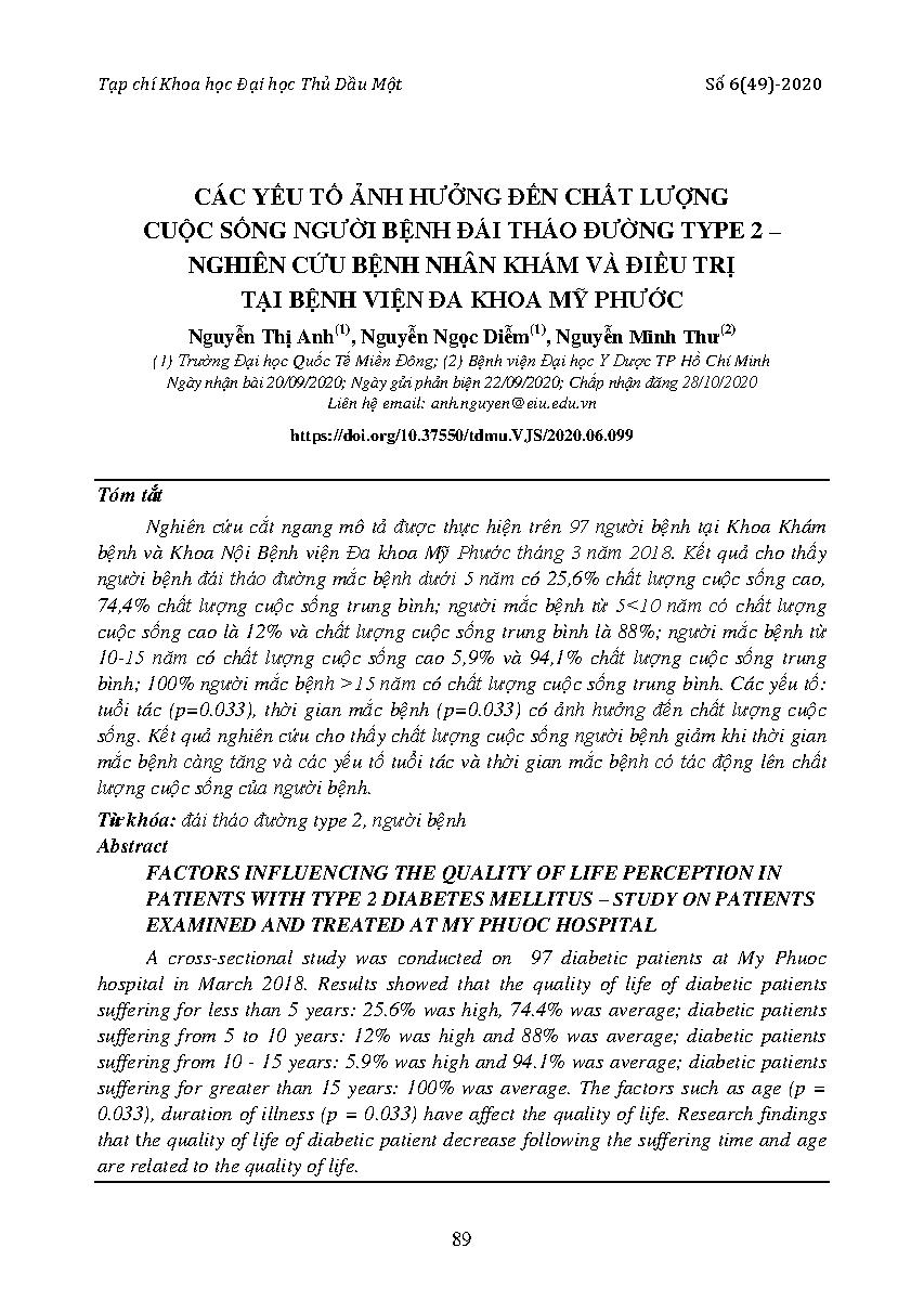 Các yếu tố ảnh hưởng đến chất lượng cuộc sống người bệnh đái tháo đường type 2 – Nghiên cứu bệnh nhân khám và điều trị tại bệnh viện đa khoa Mỹ Phước = Factors influencing the quality of life perception in patients with type 2 diabetes mellitus – Study on patients examined and treated at My Phuoc hospital
