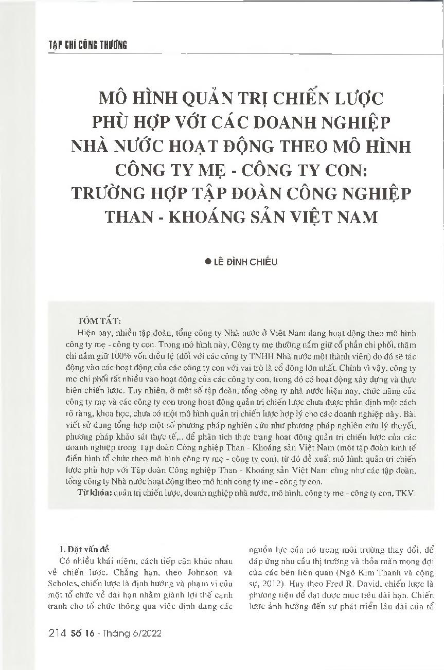 Mô hình quản trị chiến lược phù hợp với các doanh nghiệp nhà nước hoạt động theo mô hình công ty mẹ - công ty con: Trường hợp Tập đoàn công nghiệp Than - Khoáng sản Việt Nam = The suitable strategic management model for state-owned corporations operated u