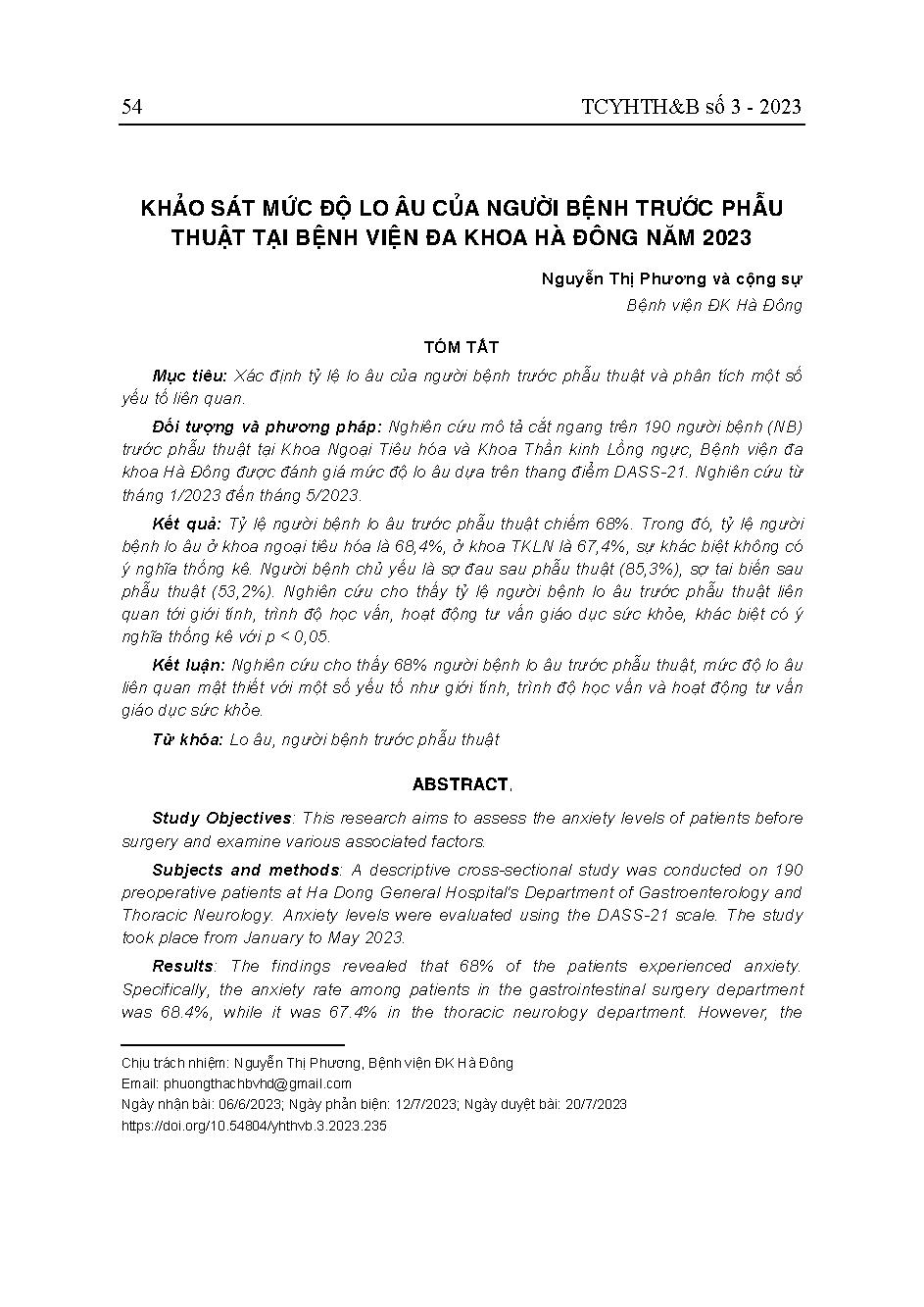 Khảo sát mức độ lo âu của người bệnh trước phẫu thuật tại Bệnh viện Đa khoa Hà Đông năm 2023 = Survey on the anxiety level of patients before surgery at Ha Dong General Hospital in 2023