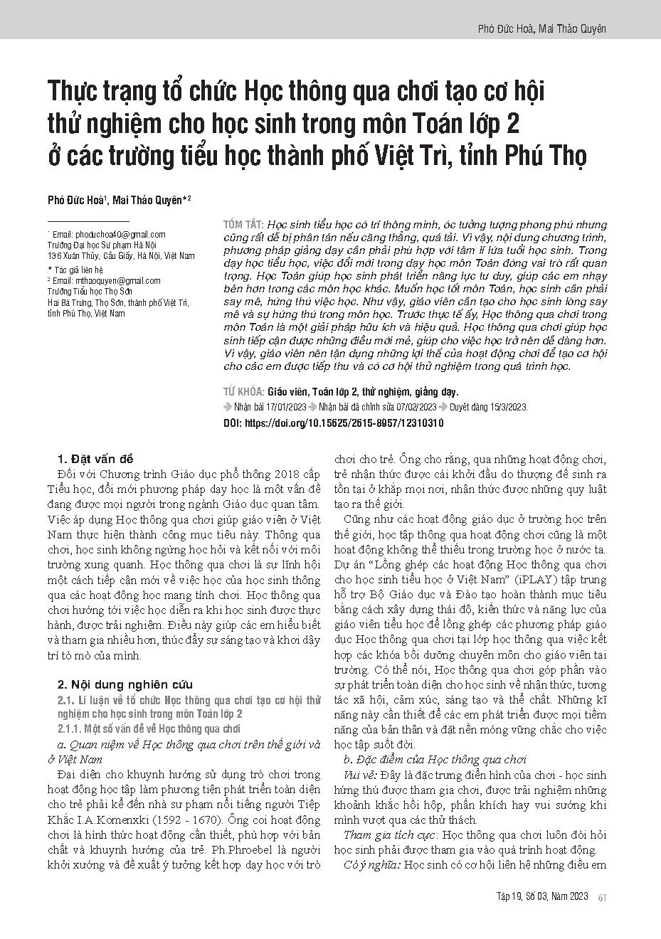 Thực trạng tổ chức Học thông qua chơi tạo cơ hội thử nghiệm cho học sinh trong môn Toán lớp 2 ở các trường tiểu học thành phố Việt Trì, tỉnh Phú Thọ = Activities to provide experimental opportunities for students in teaching grade 2 mathematics at primary