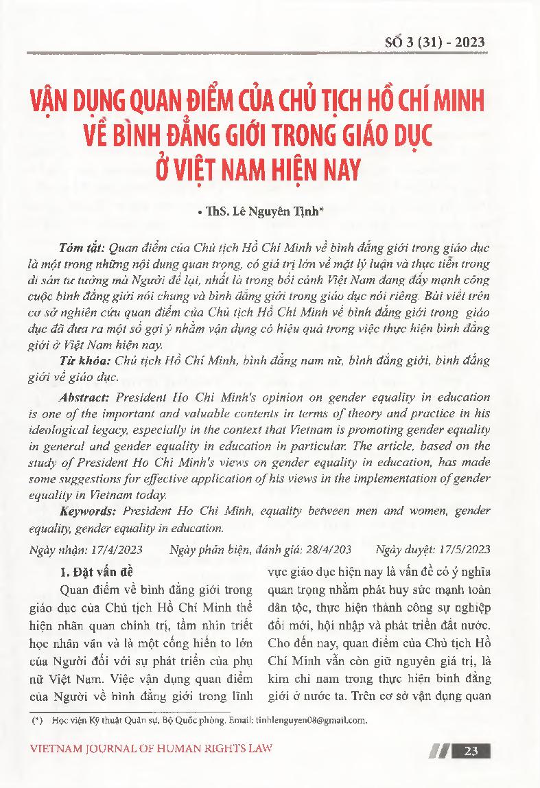 Vận dụng quan điểm của Chủ tịch Hồ Chí Minh vê' bình đẳng giới trong giáo dục ở Việt Nam hiện nay = Applying President Ho Chi Minh's view on gender equality in education in Vietnam currently