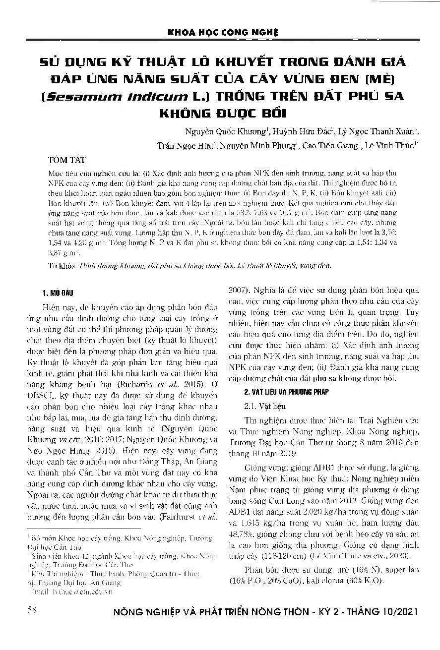 Sử dụng kỹ thuật lô khuyết trong đánh giá đáp ứng năng suất của cây vừng đen (mè) (Sesamum indicum L.) trồng trên đất phù sa không được bồi = Evaluation response of yield sesame (Sesamum indicum L.) on alluvial soil in dyke by omissiom technique
