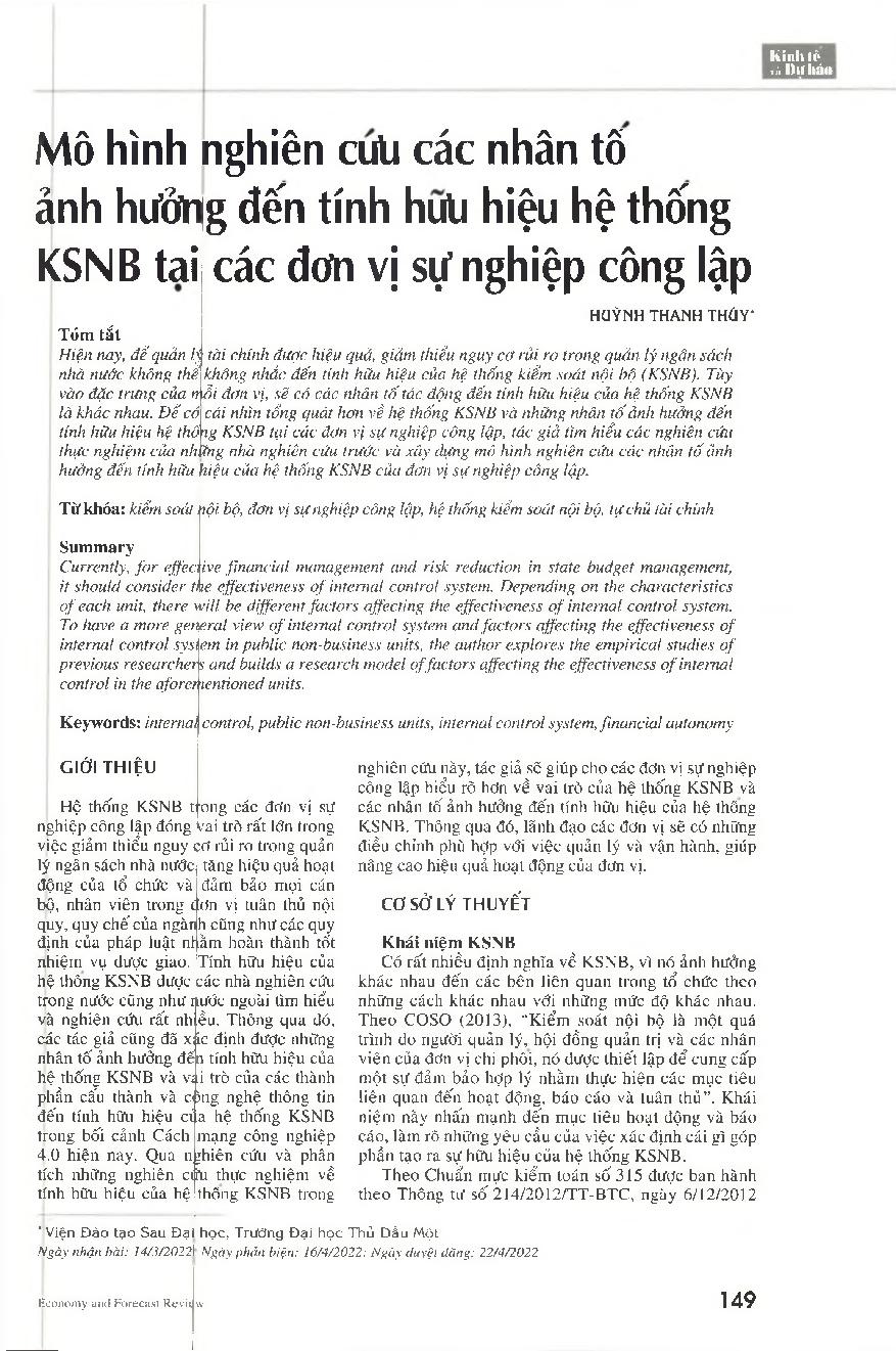 Mô hình nghiên cứu các nhân tố ảnh hưởng đến tính hữu hiệu hệ thống KSNB tại các đơn vị sự nghiệp công lập = A research model of factors affecting the effectiveness of the internal control system in public non-business units