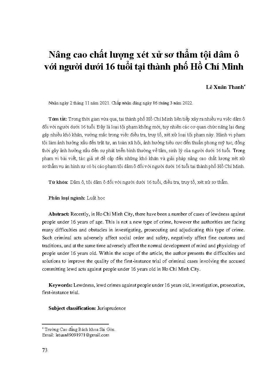 Nâng cao chất lượng xét xử sơ thẩm tội dâm ô với người dưới 16 tuổi tại thành phố Hồ Chí Minh = Enhancement of quality of handling at court of first instance in Hồ Chí Minh city against offence of engaging in sexual activities with persons under 16