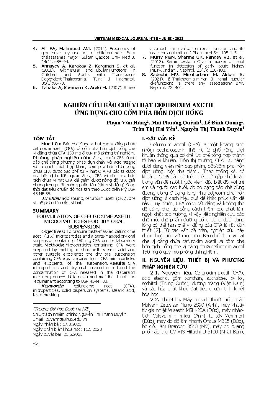 Nghiên cứu bào chế vi hạt cefuroxim axetil ứng dụng cho cốm pha hỗn dịch uống = Formulation of cefuroxime axetil microparticles for dry oral suspension