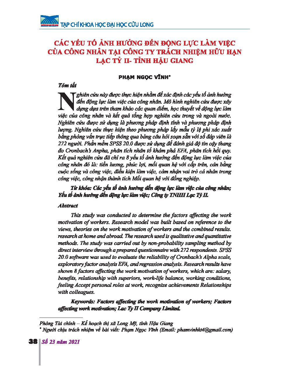 Các yếu tố ảnh hưởng đến động lực làm việc của công nhân tại công ty trách nhiệm hữu hạn Lạc Tỷ II - tỉnh Hậu Giang = Factors affecting work motivation of workers at Lac Ty II limited liability company - Hau Giang province