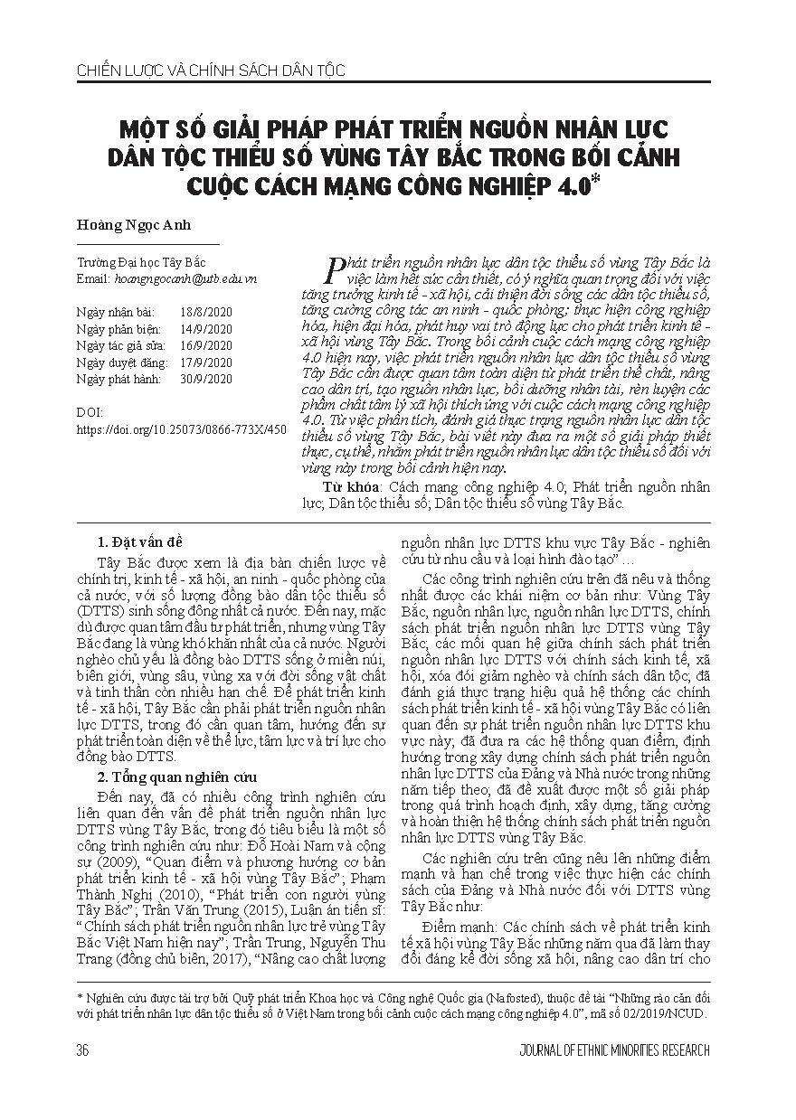 Một số giải pháp phát triển nguồn nhân lực dân tộc thiểu số vùng Tây Bắc trong bối cảnh cuộc cách mạng công nghiệp 4.0 = Some solutions for developing human resources ethnic minority population in the Northwest in the context of the industrial revolution 4.0
