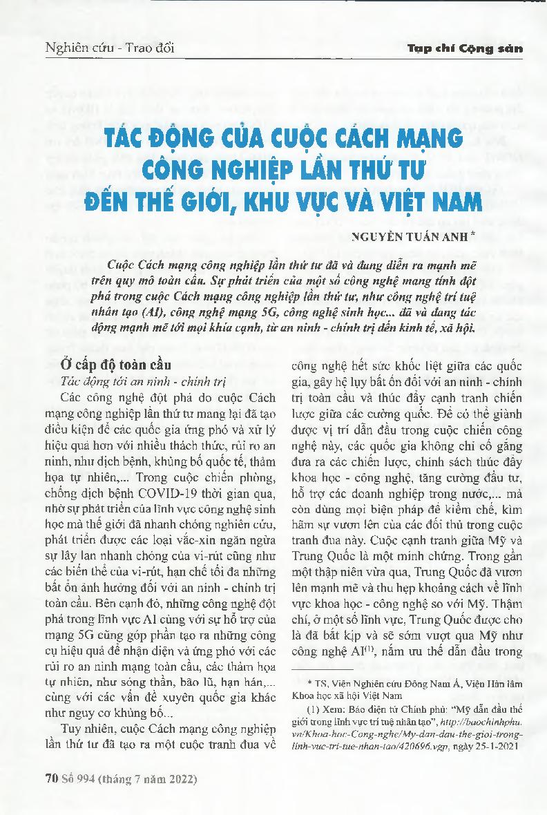 Tác động của cuộc Cách mạng công nghiệp lần thứ tư đến thế giới, khu vực và Việt Nam = Impact of the Fourth Industrial Revolution on the world, the region and Vietnam