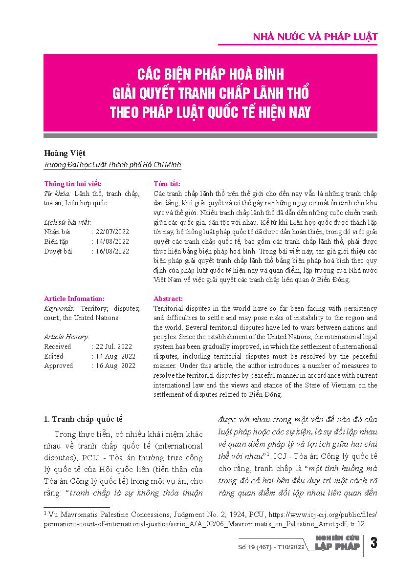 Các biện pháp hoà bình giải quyết tranh chấp lãnh thổ theo pháp luật quốc tế hiện nay = Peaceful Measures for Settlement of Territorial Disputes under the International Laws