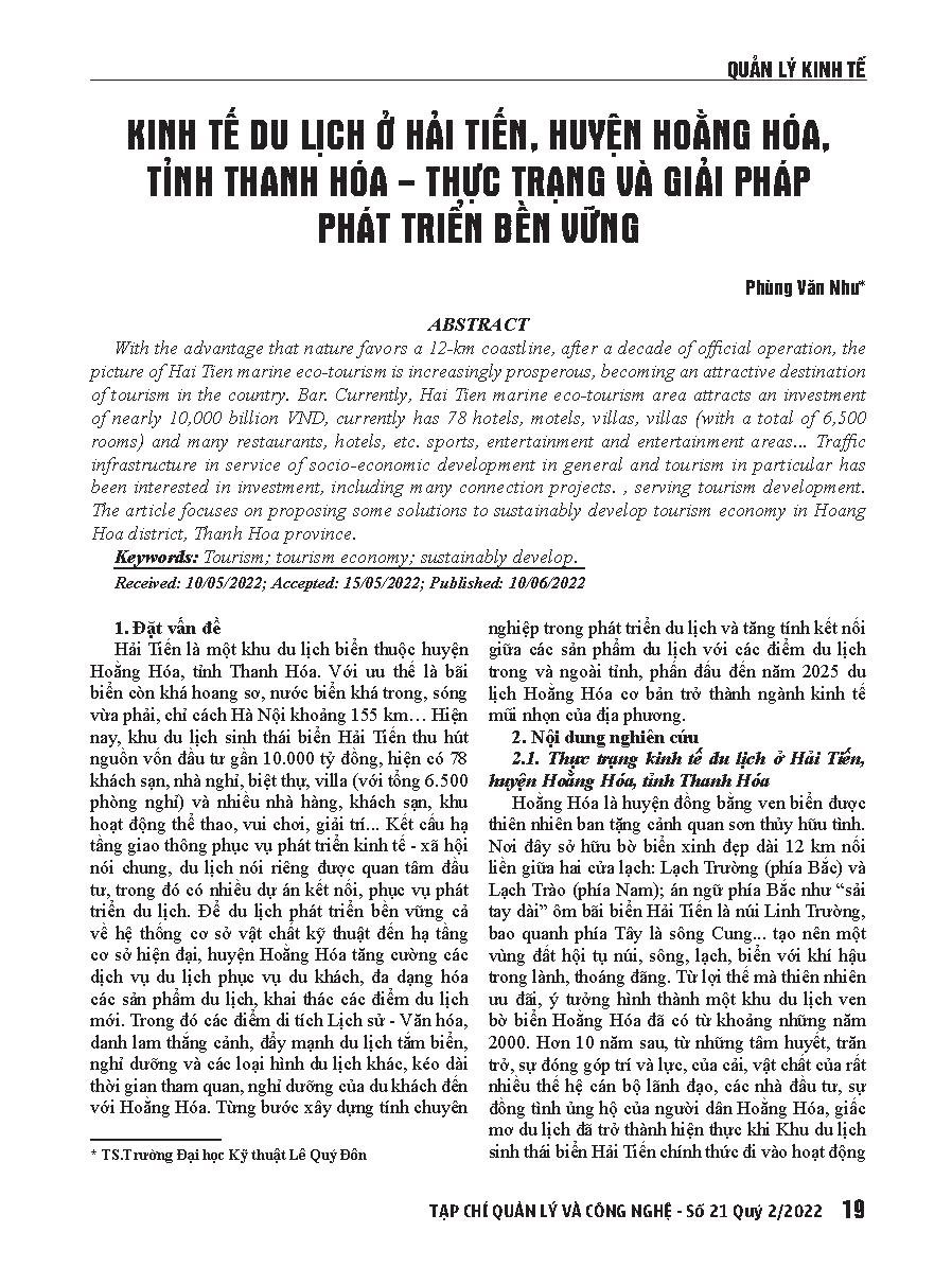 Kinh tế du lịch ở Hải Tiến, huyện Hoằng Hóa, tỉnh Thanh Hóa - Thực trạng và giải pháp phát triển bền vững = Tourism economy in Hai Tien, Hoang Hoa district, Thanh Hoa province – situation and solutions for sustainable development