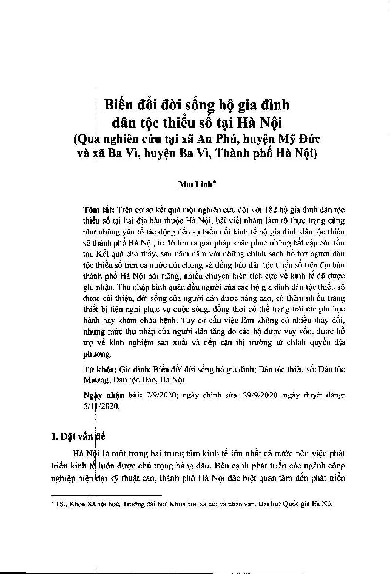 Biến đổi đời sống hộ gia đình dân tộc thiểu số tại Hà Nội (Qua nghiên cứu tại xã An Phú, huyện Mỹ Đức và xã Ba Vì, huyện Ba Vì, Thành phố Hà Nội) = Changes in the Life of Ethnic Minority Households in Hanoi (Through a Study in An Phu Commune, My Duc District and Ba Vi Commune, Ba Vi District of Hanoi)