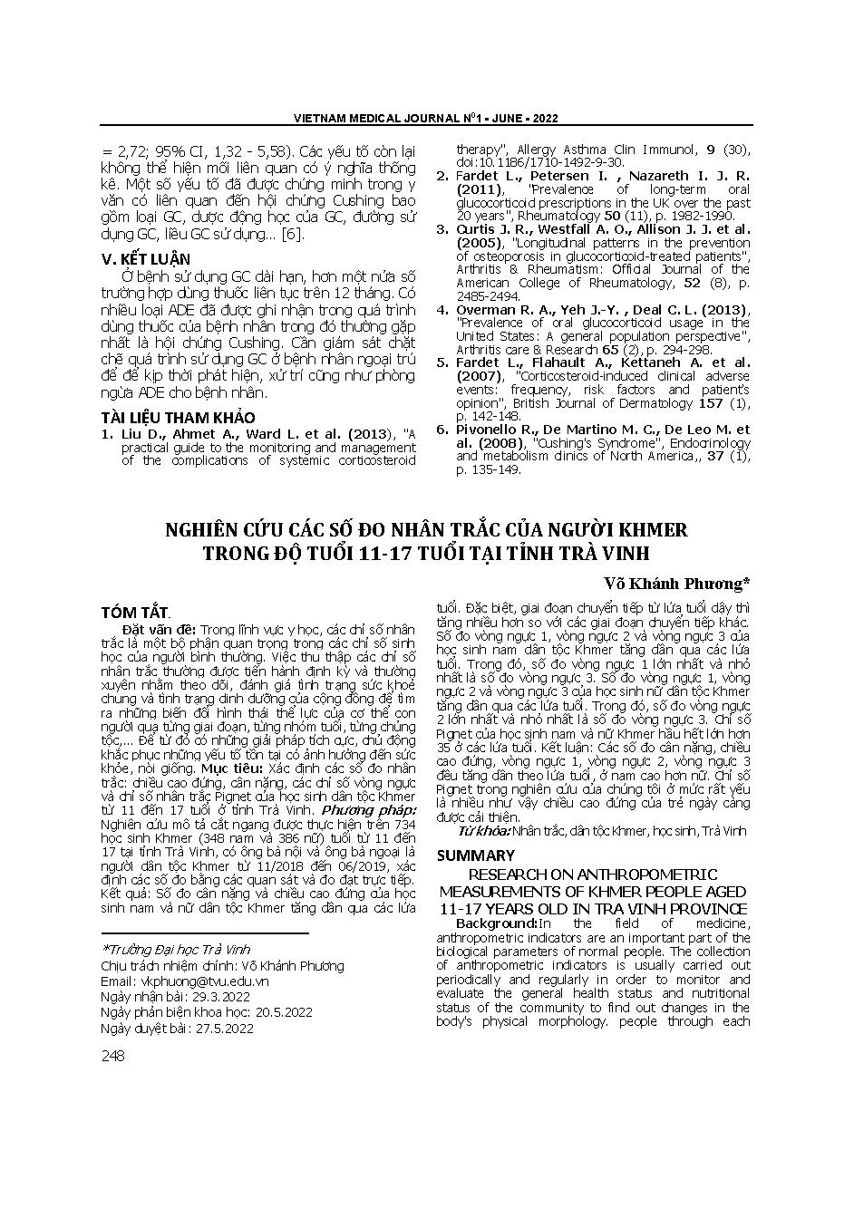Nghiên cứu các số đo nhân trắc của người Khmer trong độ tuổi 11-17 tuổi tại tỉnh Trà Vinh = Research on anthropometric measurements of Khmer people aged 11-17 years old in Tra Vinh province