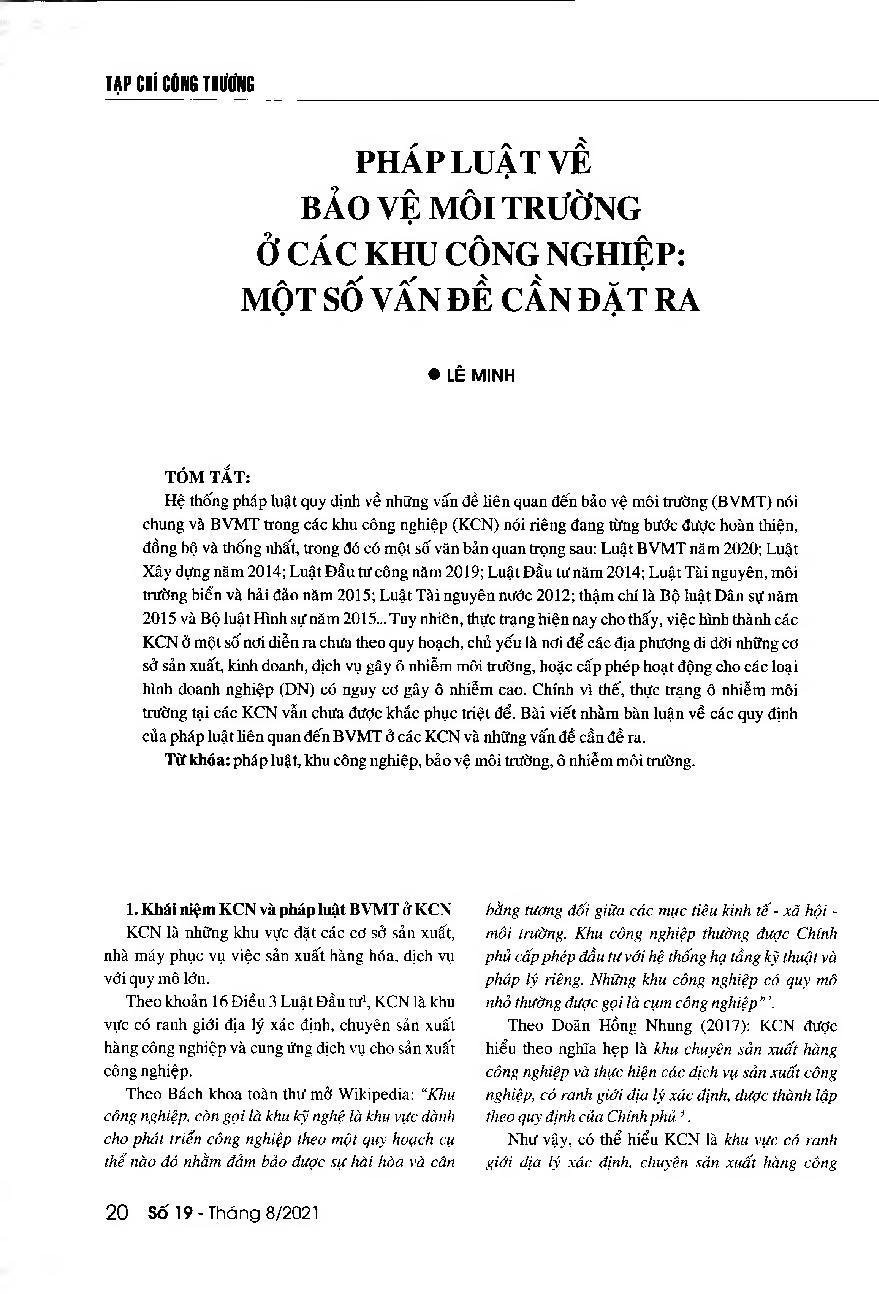 Pháp luật về bảo vệ môi trường ở các khu công nghiệp: Một số vấn đề cần đặt ra = Vietnam's regulations on the environmental protection in industrial zones and some related issue