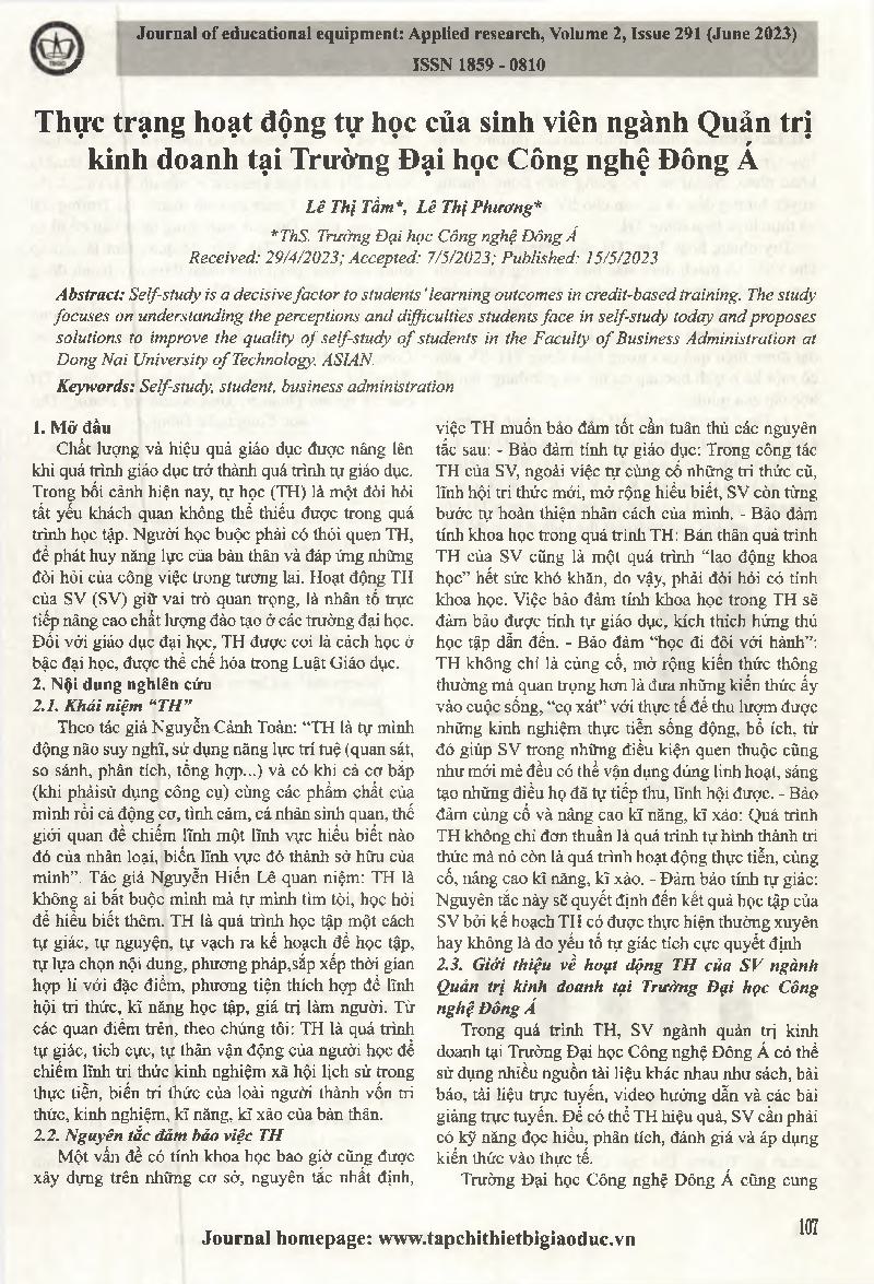 Thực trạng hoạt động tự học của sinh viên ngành Quản trị kinh doanh tại Trường Đại học Công nghệ Đông Á = Actual situation of self-study activities of students majoring in Business Administration at Dong A University of Technology