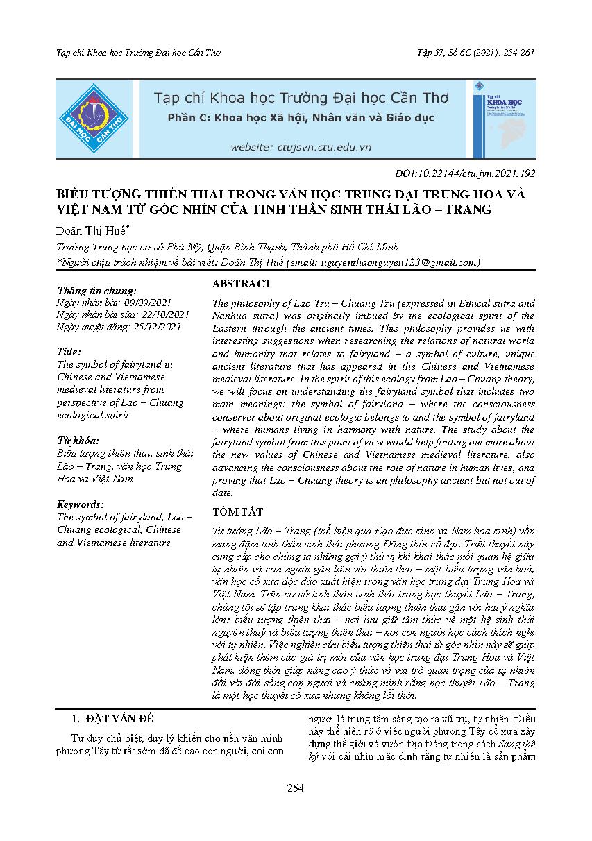Biểu tượng thiên thai trong văn học trung đại Trung Hoa và Việt Nam từ góc nhìn của tinh thần sinh thái Lão – Trang = The symbol of fairyland in Chinese and Vietnamese medieval literature from perspective of Lao – Chuang ecological spirit