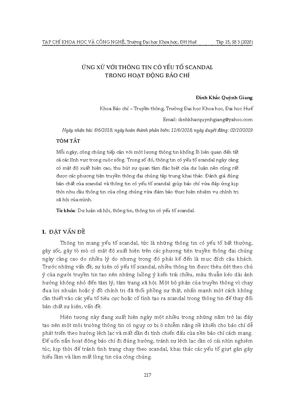 Ứng xử với thông tin có yếu tố scandal trong hoạt động báo chí = Behavior towards scandalous information of journalism