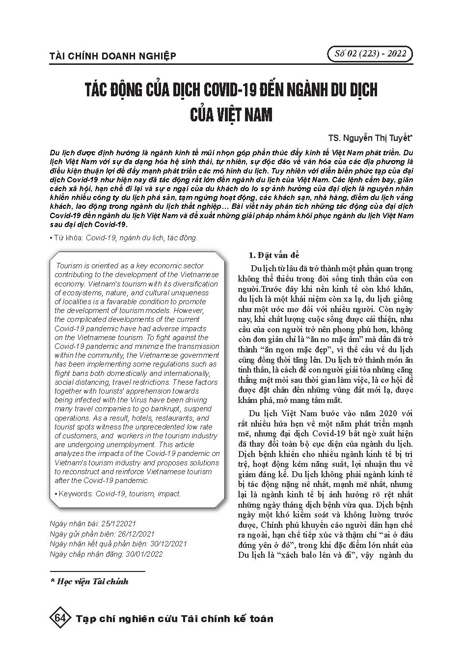 Tác động của Covid-19 đến ngành du lịch Việt Nam = Impact of Covid-19 on Vietnamese tourism industry