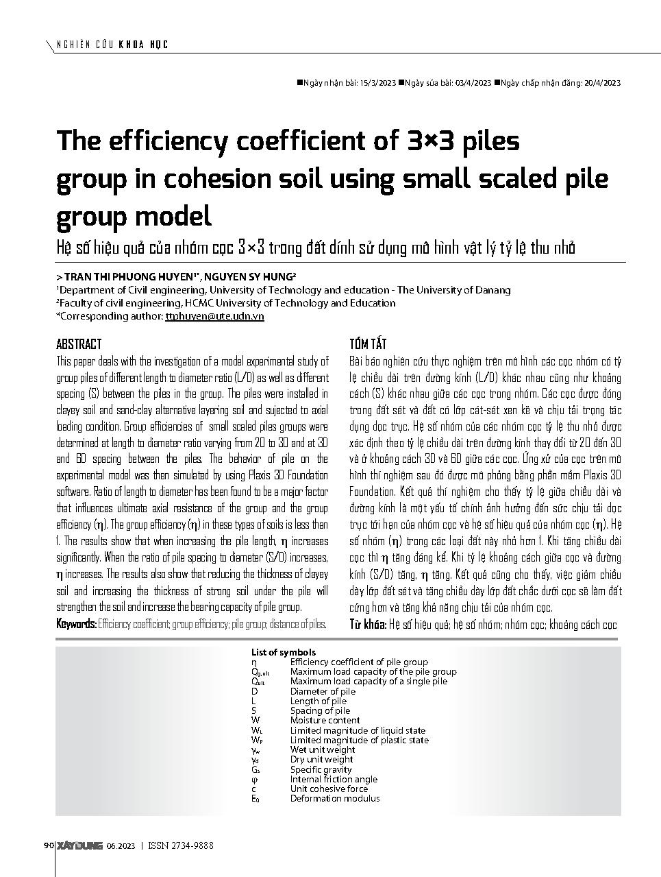 Hệ số hiệu quả của nhóm cọc 3×3 trong đất dính sử dụng mô hình vật lý tỷ lệ thu nhỏ = The efficiency coefficient of 3×3 piles group in cohesion soil using small scaled pile group model