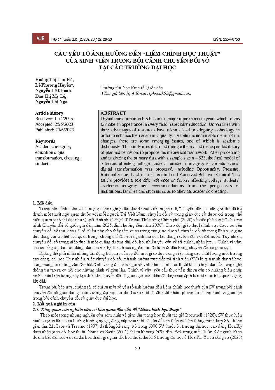 Các yếu tố ảnh hưởng đến "Liêm chính học thuật" của sinh viên trong bối cảnh chuyển đổi số tại các trường đại học = Factors affecting students' "Academic Integrity" in the context of digital transformation at universities