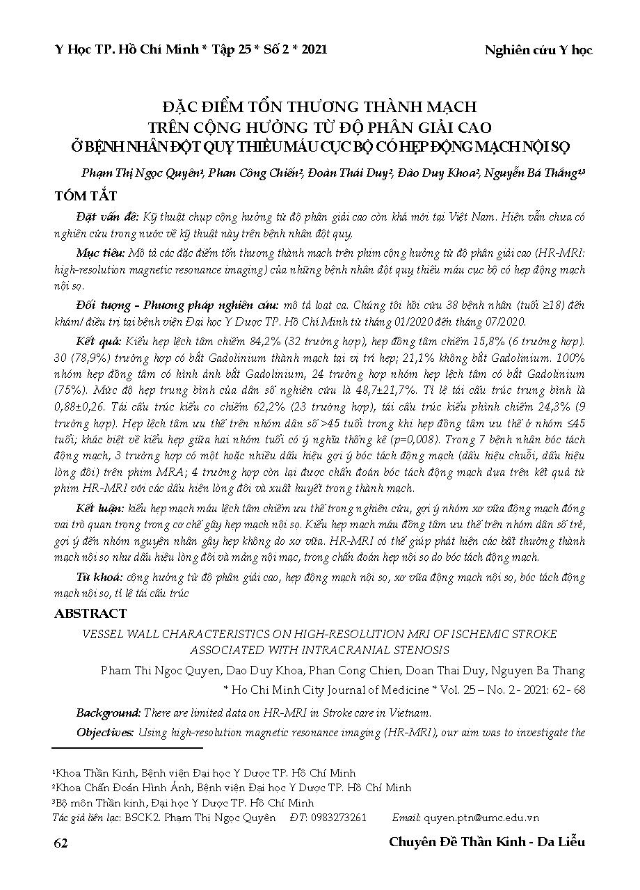 Đặc điểm tổn thương thành mạch trên cộng hưởng từ độ phân giải cao ở bệnh nhân đột quỵ thiếu máu cục bộ có hẹp động mạch nội sọ = Vessel wall characteristics on high-resolution mri of ischemic stroke associated with intracranial stenosis