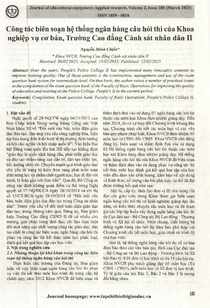 Công tác biên soạn hệ thống ngân hàng câu hỏi thi của Khoa nghiệp vụ cơ bản, Trường Cao đẳng Cảnh sát nhân dân II = Compilation of the exam question bank system of the basic professional department at People's Police College II