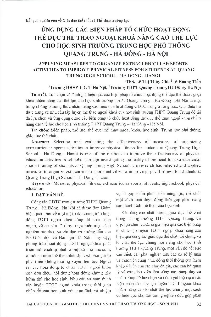 Ứng dụng các biện pháp tổ chức hoạt động thể dục thể thao ngoại khóa nâng cao thể lực cho học sinh trường THPT Quang Trung - Hà Đông - Hà Nội = Applying measures to organize extracurricular sports activities to improve physical fitness for students at Qua