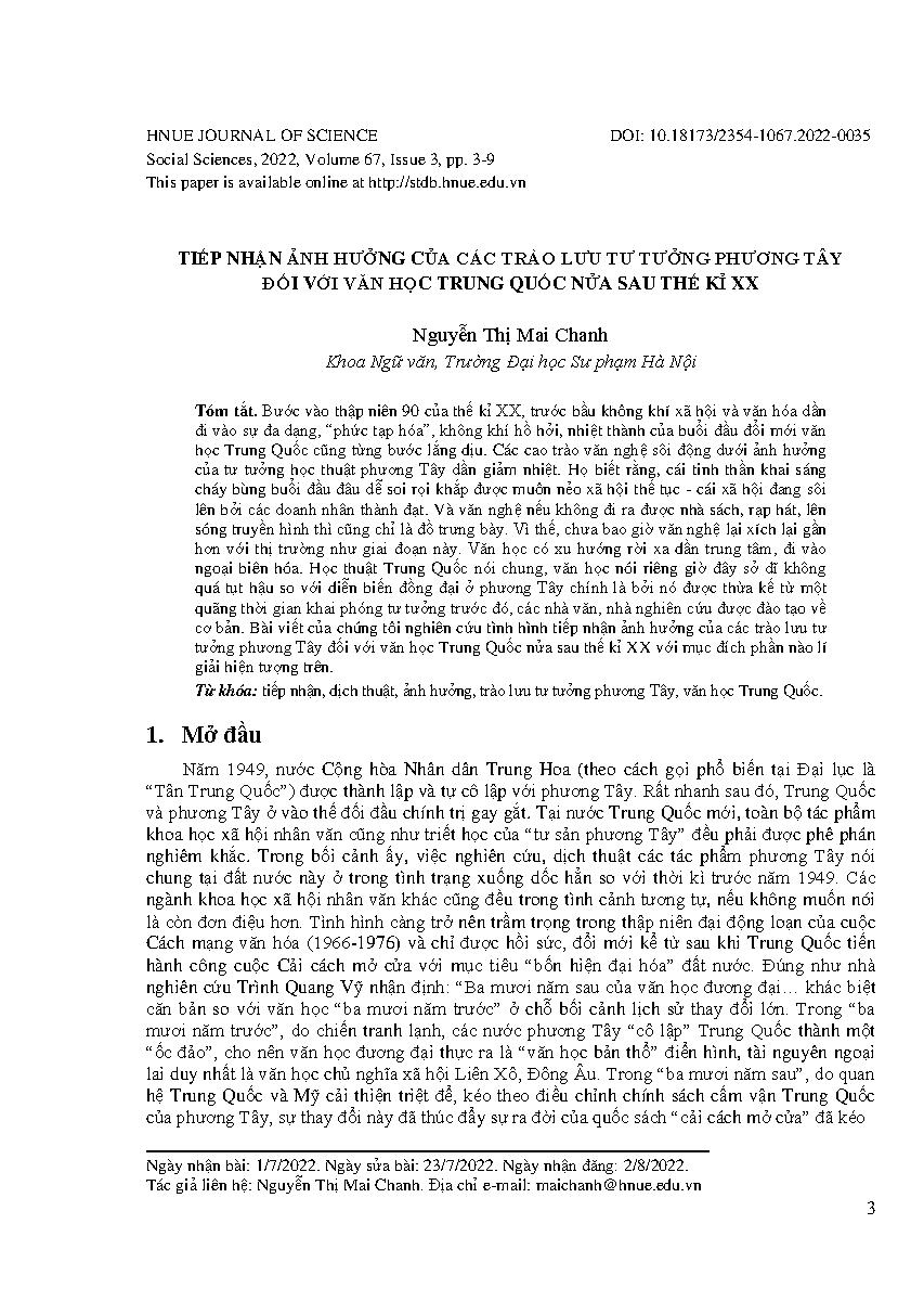 Tiếp nhận ảnh hưởng của các trào lưu tư tưởng phương Tây đối với văn học Trung Quốc nửa sau thế kỉ XX = On the reception of the influence from Western philosophical trends on Chinese literature by the second half of the 20th century