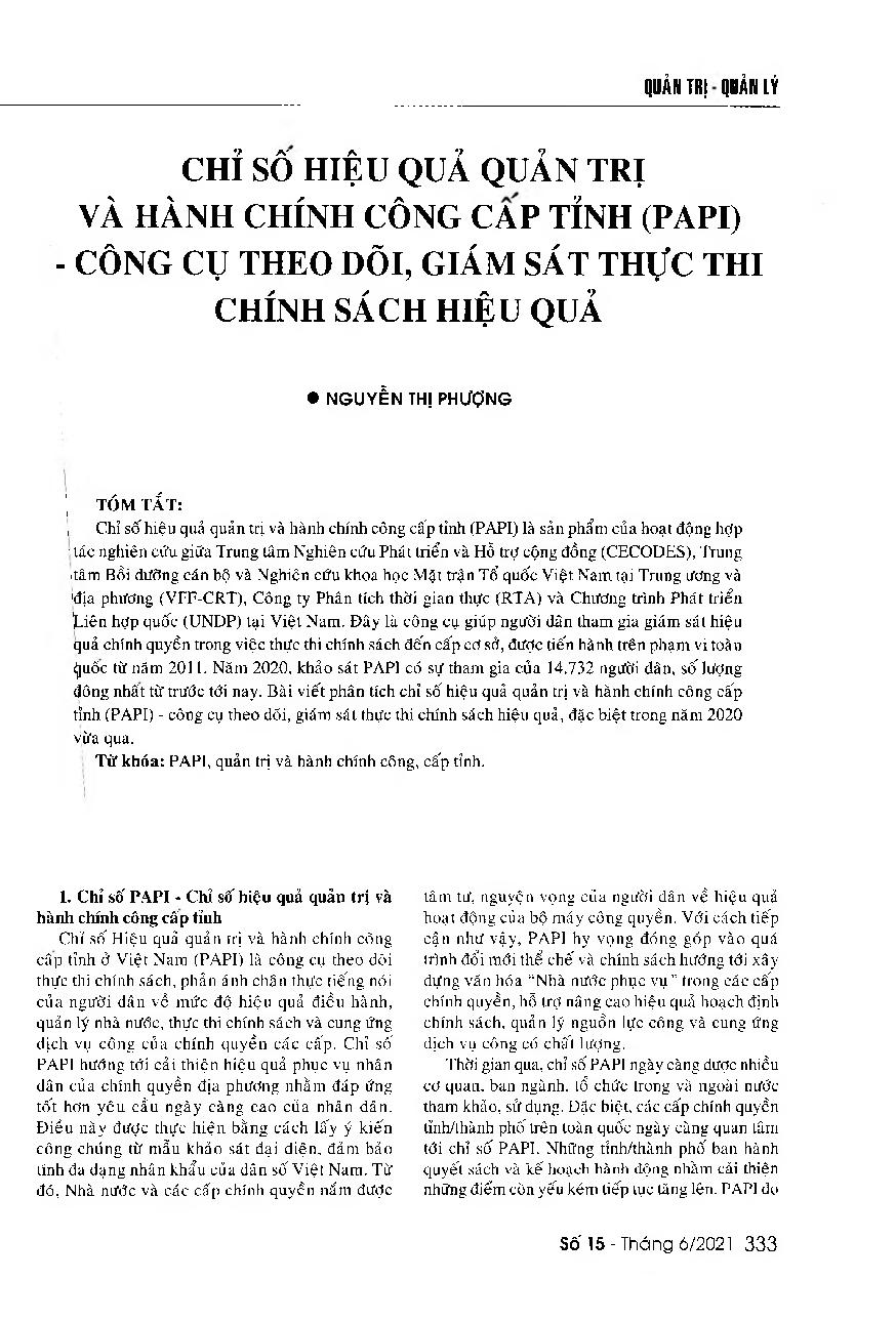Chỉ rõ hiệu quả quản trị và hành chính công cấp tỉnh (PAPI) - Công cụ theo dõi, giám sát thực thi chính sách hiệu quả = The Vietnam Provincial Governance and Public Administration Performance Index (PAPI) - Tool for monitoring the implementation of policies