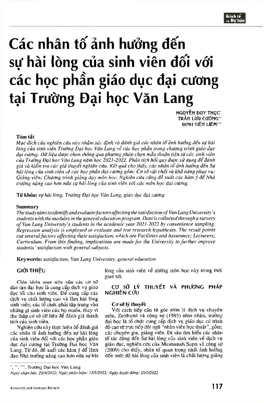 Các nhân tố ảnh hưởng đến sự hài lòng của sinh viên đối với các học phần giáo dục đại cương tại Trường Đại học Văn Lang = Factors affecting the satisfaction of Van Lang University’s students with the modules in the general education