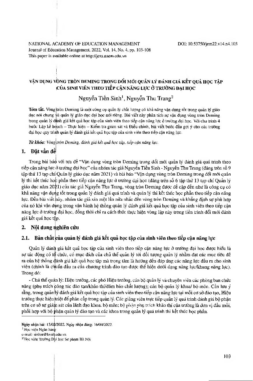 Vận dụng vòng tròn Deming trong đổi mới quản lý đánh giá kết quả học tập của sinh viên theo tiếp cận năng lực ở trường đại học = Applications of the denting cylce into innovating the management of competence-based assessment at university
