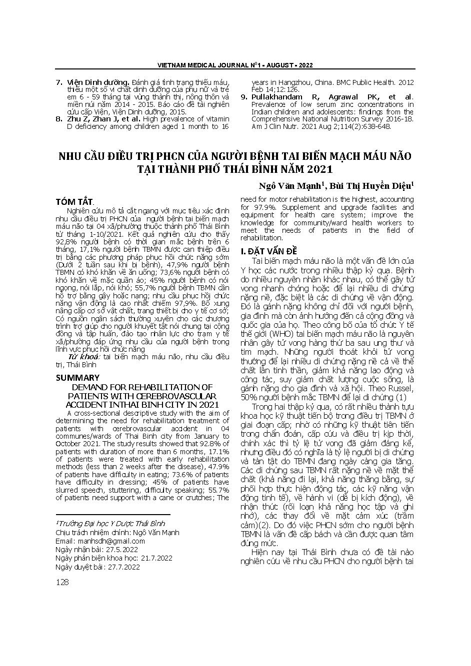 Nhu cầu điều trị phục hồi chức năng của người bệnh tai biến mạch máu não tại thành phố Thái Bình năm 2021 = Demand for rehabilitation of patients with cerebrovascular accident in Thai Binh city in 2021