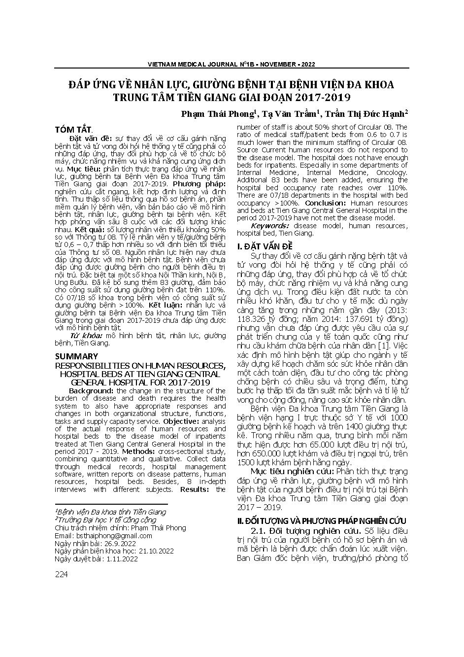 Đáp ứng về nhân lực, giường bệnh tại Bệnh viện Đa khoa Trung tâm Tiền Giang giai đoạn 2017-2019 = Responsibilities on human resources, hospital beds at Tien Giang central general hospital for 2017-2019