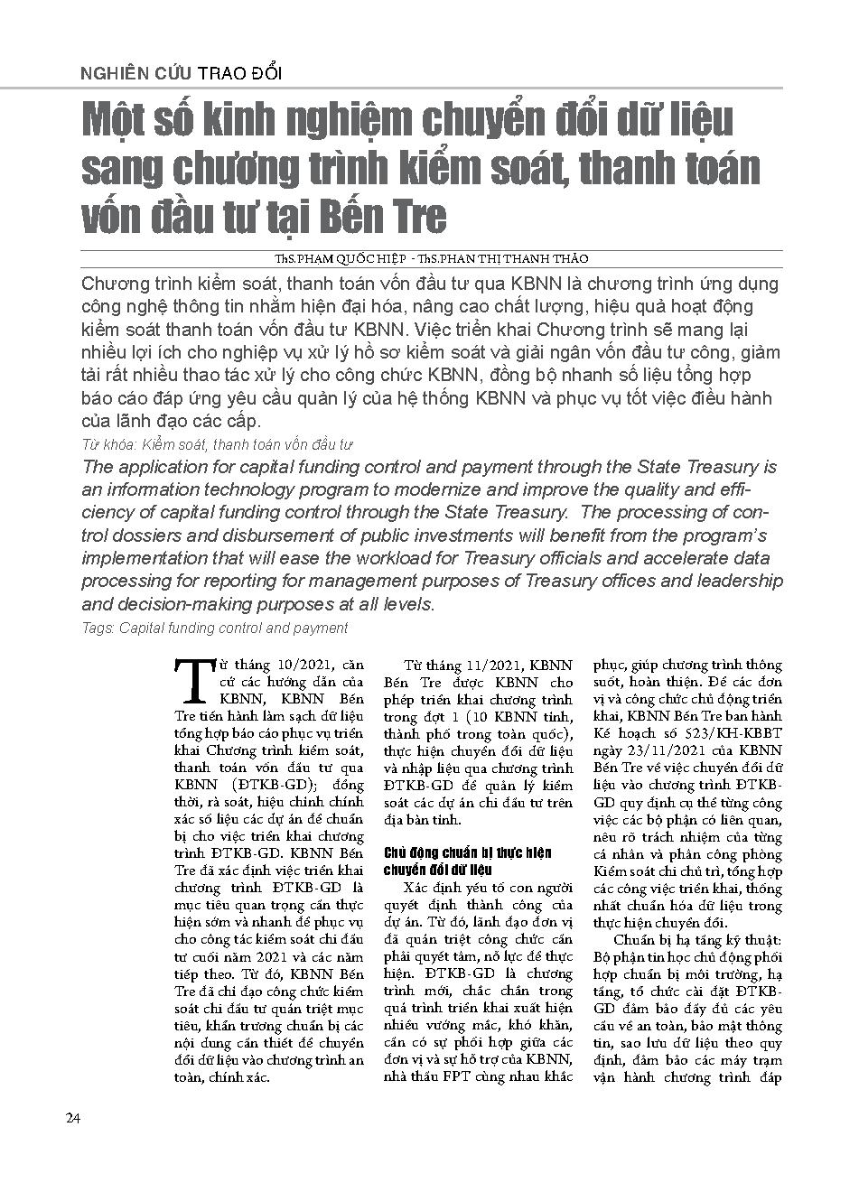 Một số kinh nghiệm chuyển đổi dữ liệu sang chương trình kiểm soát, thanh toán vốn đầu tư tại Bến Tre = Some experience in converting data to control and payment program for investment capital in Ben Tre