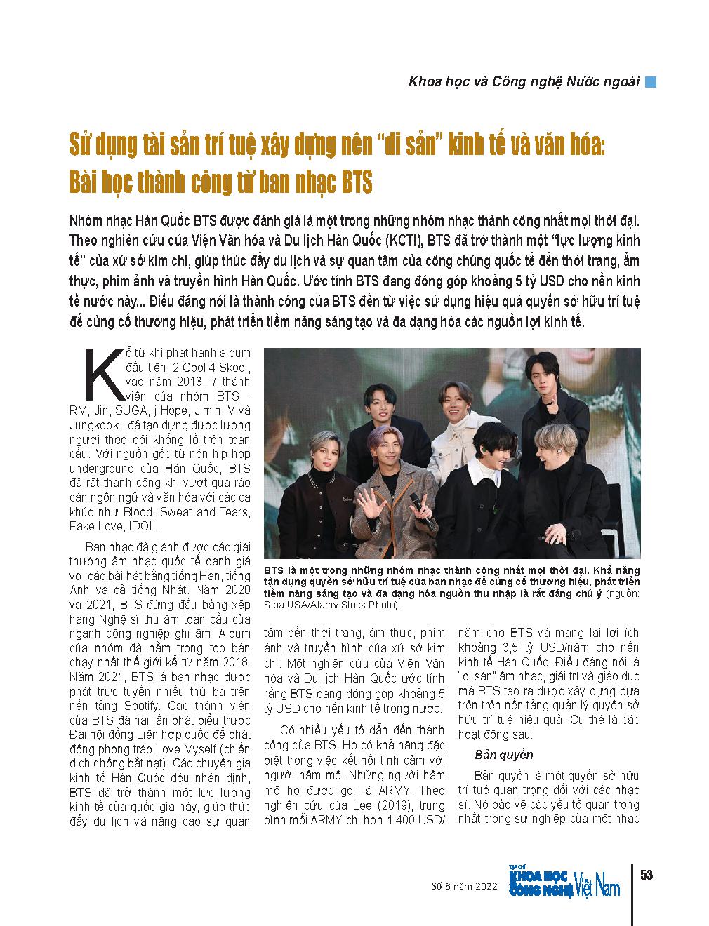 Sử dụng tài sản trí tuệ xây dựng nên “di sản” kinh tế và văn hóa: Bài học thành công từ ban nhạc BTS = Using intellectual property to build an economic and cultural "legacy": Success lessons from BTS