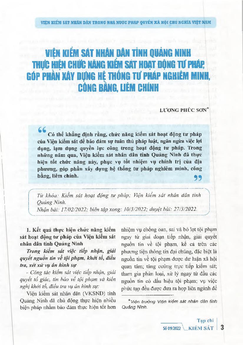 Viện kiểm sát nhân dân tỉnh Quảng Ninh thực hiện chức năng kiểm sát hoạt động tư pháp góp phần xây dựng hệ thống tư pháp nghiêm minh, công bằng, liêm chính
