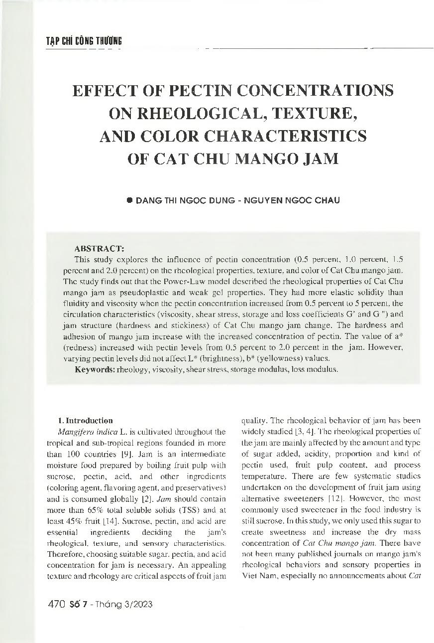 Khảo sát ảnh hưởng của nồng độ pectin đến tính chất lưu biến, kết cấu và màu sắc của mứt đông xoài cát Chu = Effect of pectin concentrations on rheological, texture, and color characteristics of Cat Chu mango jam