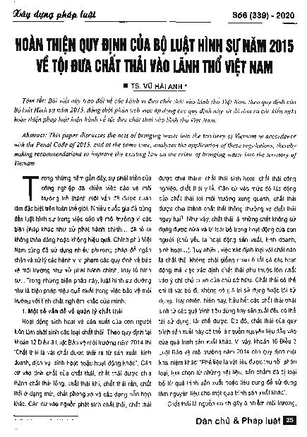 Hoàn thiện quy định của Bộ luật Hình sự năm 2015 về tội đưa chất thải và lãnh thổ Việt Nam = Complete the provisions of the Criminal Code 2015 on the crime of sending waste and the territory of Vietnam