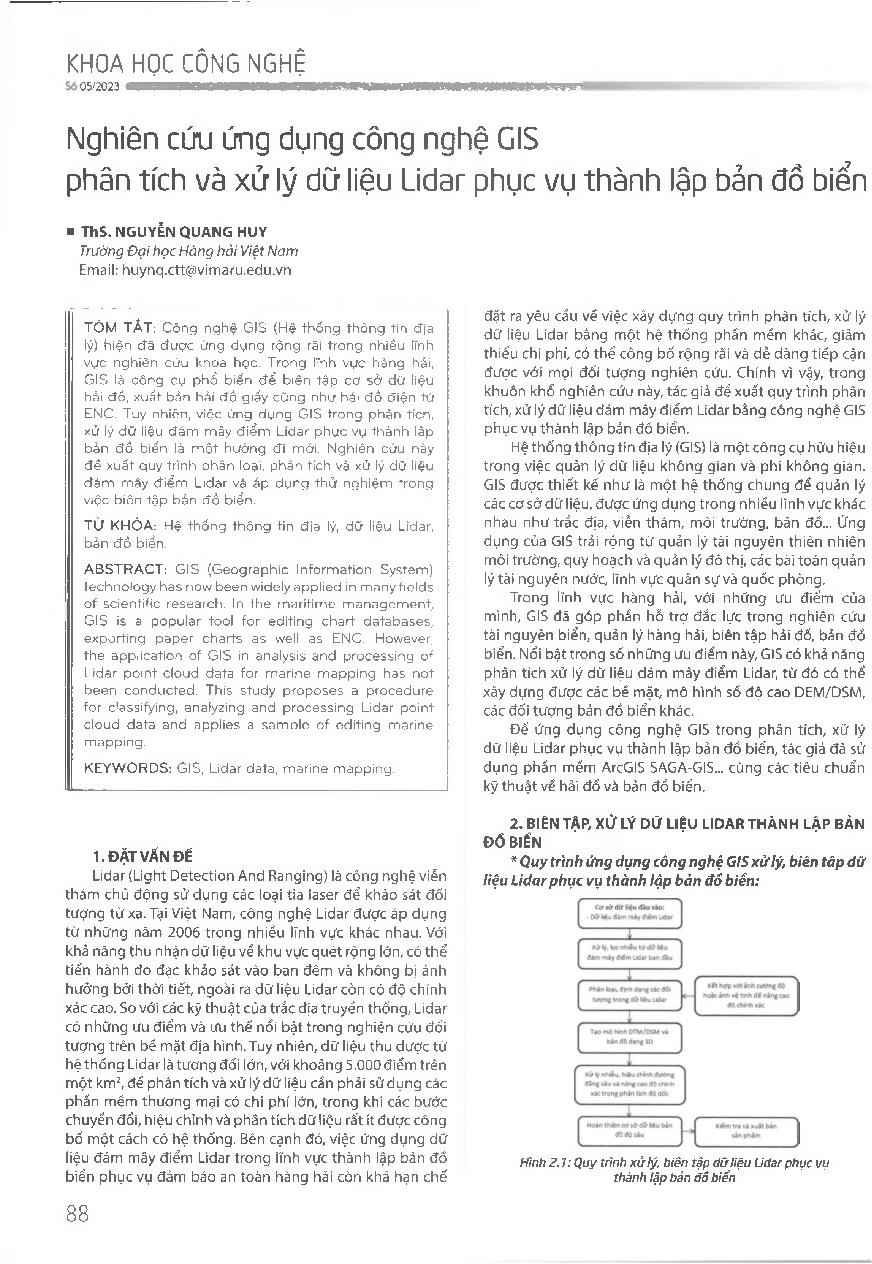 Nghiên cứu ứng dụng công nghệ GIS phân tích và xử lý dữ liệu Lidar phục vụ thành lập bản đồ biển = Applying GIS technology to analyze and process Lidar data for marine mapping