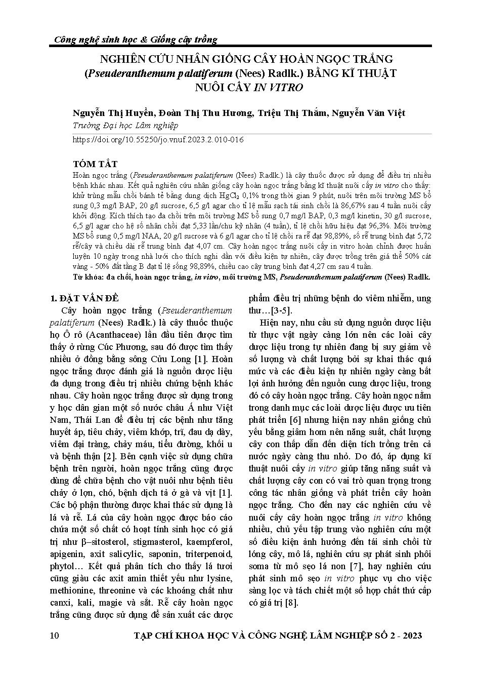 Nghiên cứu nhân giống cây hoàn ngọc trắng (pseuderanthemum palatiferum (nees) radlk.) bằng kĩ thuật nuôi cấy in vitro = Micropropagation of pseuderanthemum palatiferum (nees) radlk.