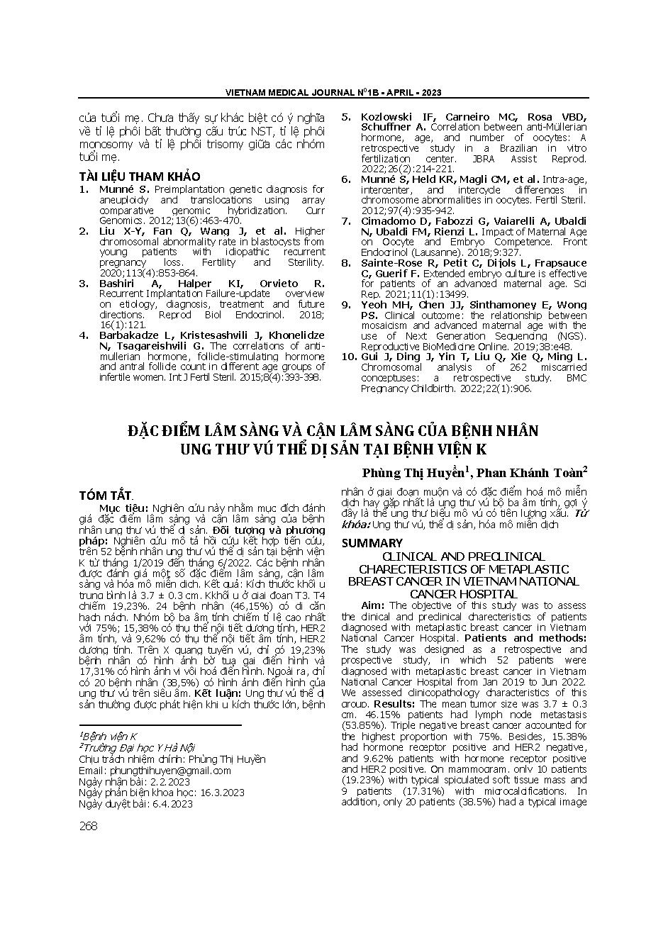 Đặc điểm lâm sàng và cận lâm sàng của bệnh nhân ung thư vú thể dị sản tại Bệnh viện K = Clinical and preclinical characteristics of metaplastic breast cancer in Vietnam national cancer hospital