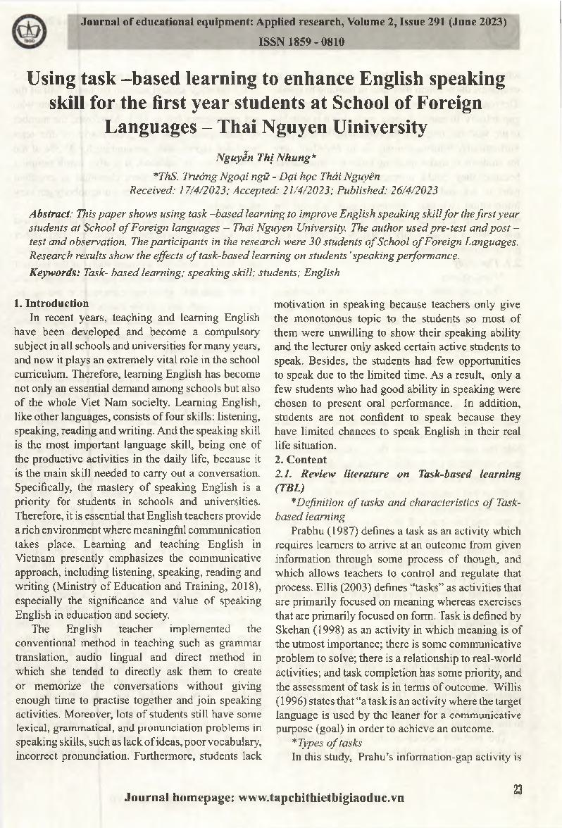 Sử dụng phương pháp học tập dựa trên nhiệm vụ để nâng cao kỹ năng nói tiếng Anh cho sinh viên năm thứ nhất Khoa Ngoại ngữ - Đại học Thái Nguyên = Using task -based learning to enhance English speaking skill for the first year students at School of Foreign