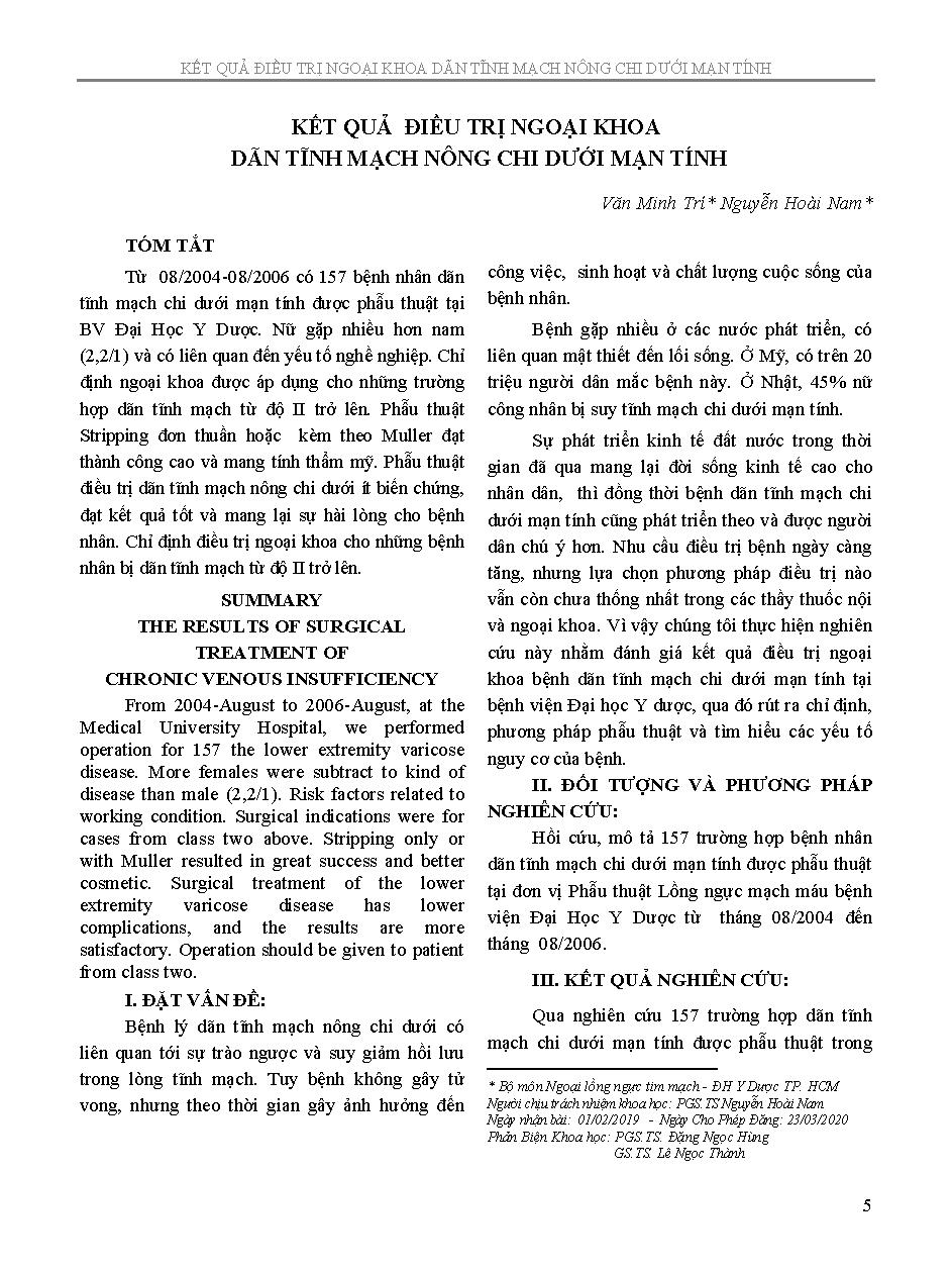 Kết quả điều trị ngoại khoa dãn tĩnh mạch nông chi dưới mạn tính = The results of surgical treatment of chronic venous insufficiency